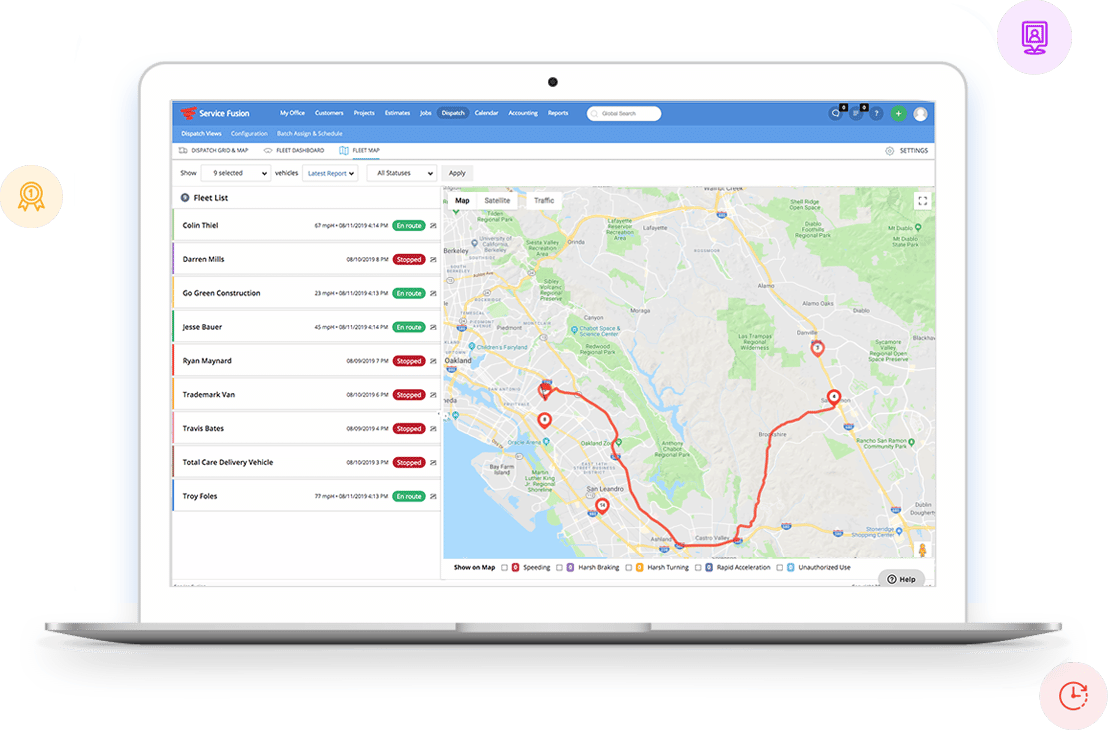 Track service vehicles in real time. Monitor location, distance driven, idle time, engine status, and fuel level.