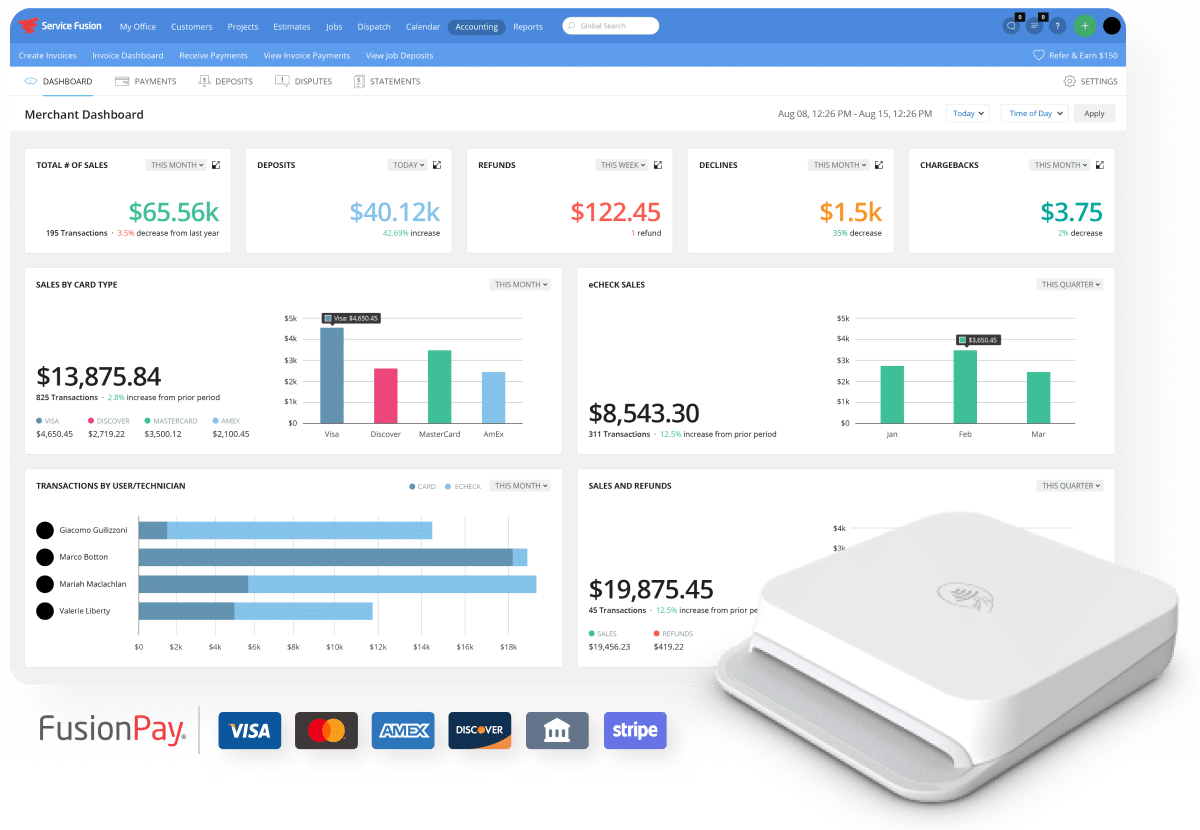 Quickly convert estimates to jobs, then invoice and accept payments online and in the field with our Stripe mobile card reader