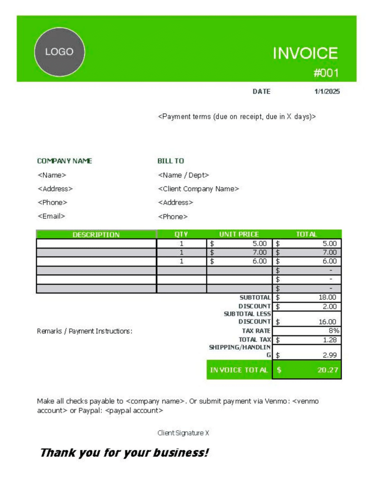 Lastly, you don’t want to forget a list of the payment terms. This includes the payment due date, such as “due on receipt” (the total amount is due at signing) or “net 30” (the full payment is due within 30 days). It will also include information on early payment discounts, possible late fees, and any other processing charges, such as a credit card fee.